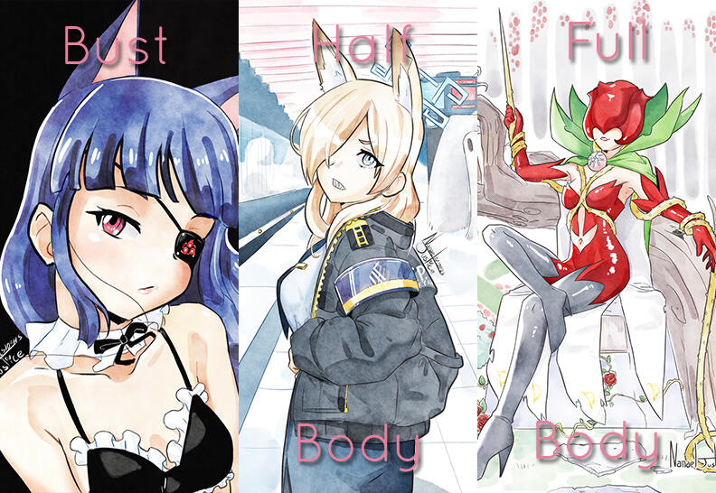 ● Some characters are disproportionately more difficult to draw than normal. In those cases, an extra 10 to 45% can be added to the regular price, depending on the design.